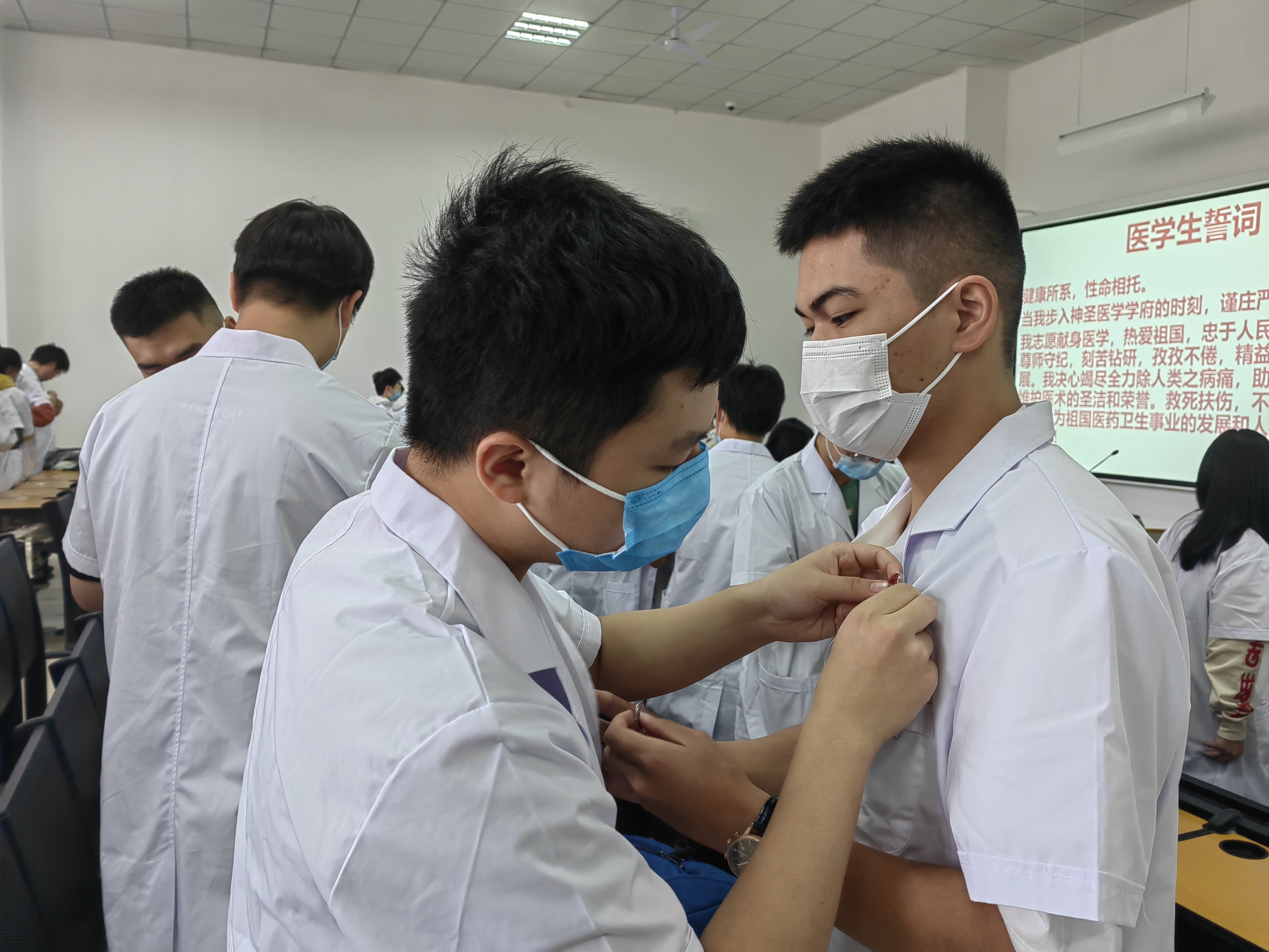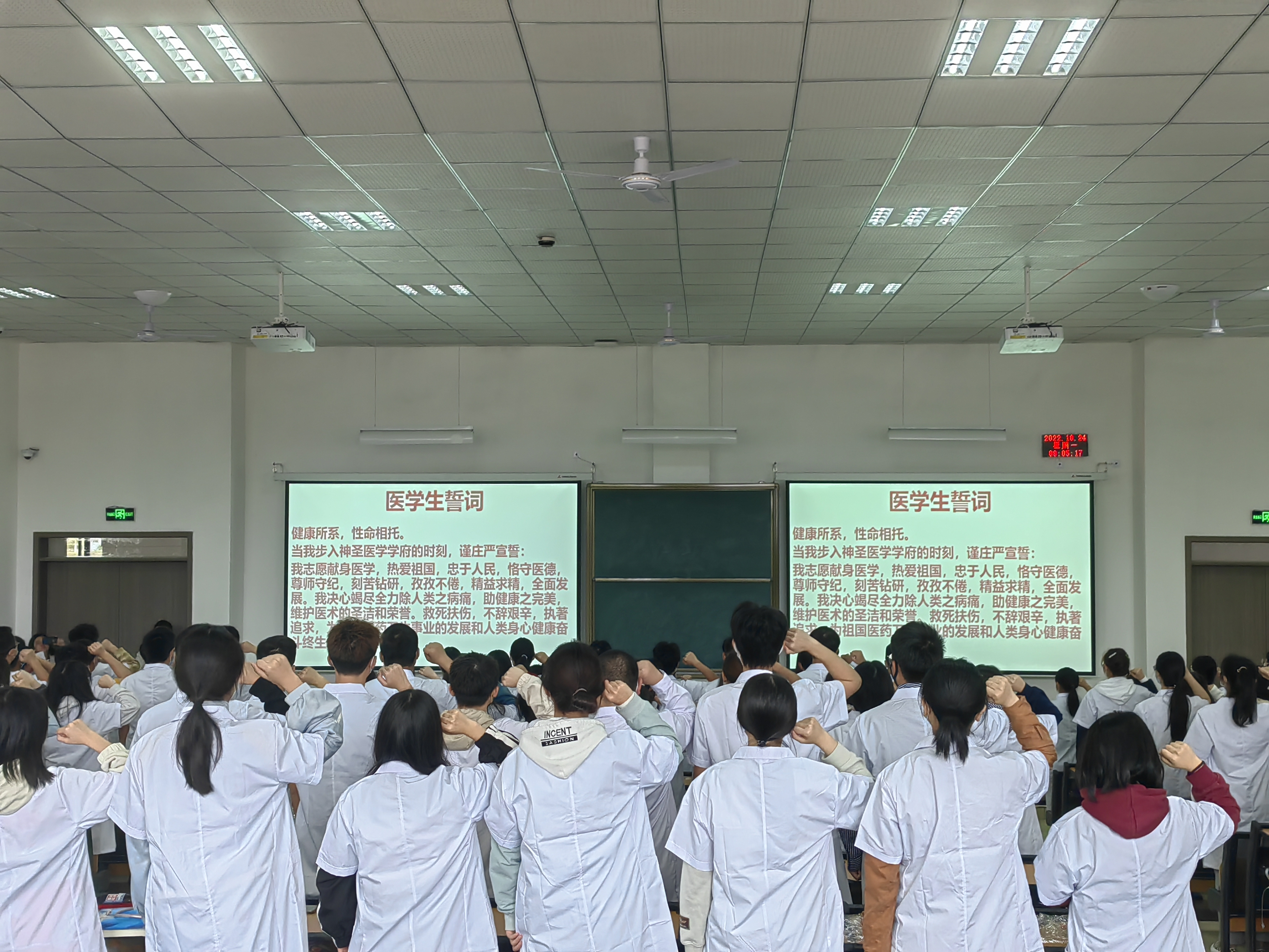 接着,举行了校徽佩戴仪式,全体新生在现场集体佩戴了校徽,熠熠闪光的校徽既是“遵医人”的象征,更是“明德笃学 求是致用”的精神载物。同时,为了巩固医员工的专业思维,感知医学的神圣,公司特意组织了充满仪式的宣誓环节,由PA视讯经理刘兴奎教授带领全体新生进行医员工誓言宣誓,神圣的医员工誓言声声入耳,句句入心。